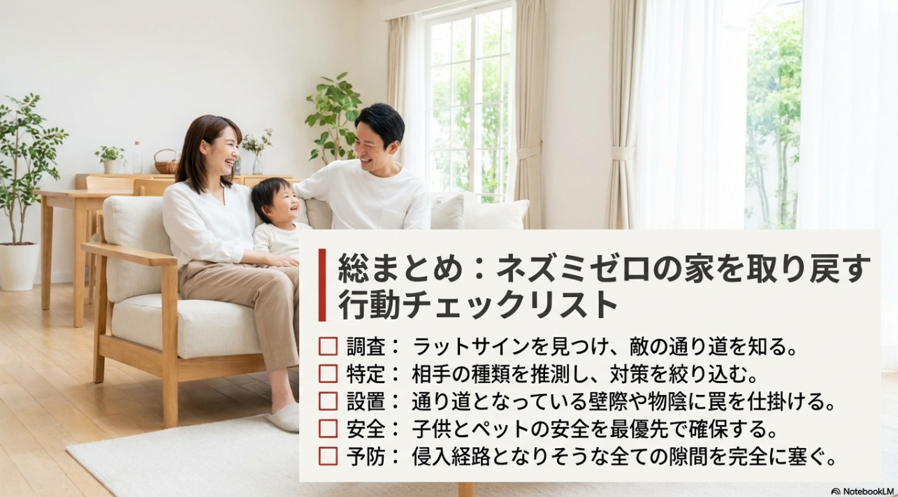 ここまで読んでくれたあなたなら、もう「ネズミ駆除の市販おすすめ=商品ランキング」じゃないって分かってきたと思います。 私の結論はシンプルで、勝つのは“順番”です。 追い出し→捕獲/毒餌→侵入口封鎖をセットで回す。これが最短ルートになりやすい。 もちろん家の条件で多少前後しますが、骨格はこれでOKです。
