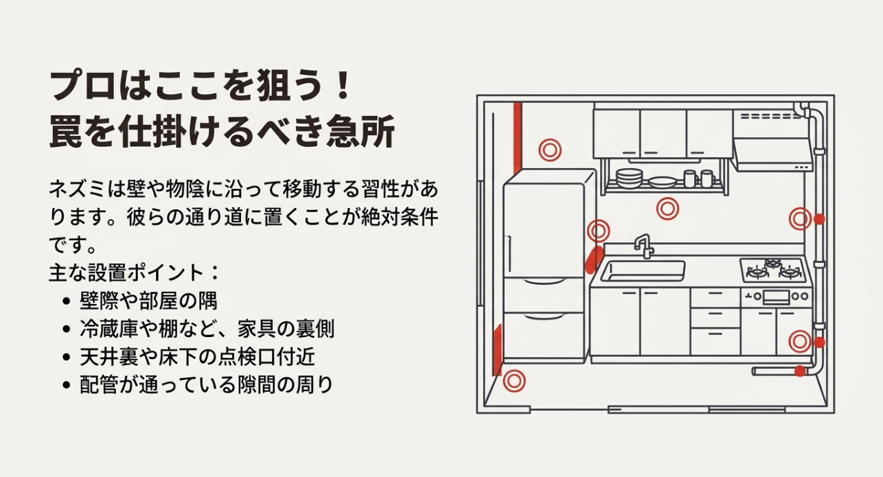 ネズミは壁沿いに移動する傾向があるので、基本は壁際。 さらに、明るい場所より暗所、開けた場所より物陰を好みます。 つまり、あなたが置くべき場所は「キッチンの真ん中」じゃなくて、流し台下・冷蔵庫の裏・食器棚の隙間・家電の裏・配管の周りみたいな“陰”です。 天井裏に気配があるなら、投げ込みタイプのように巣に近い領域へ届く形も相性が良くなりやすいです。