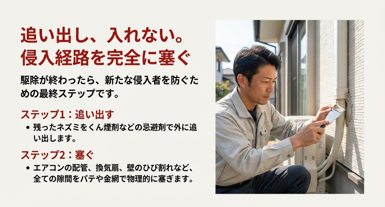 - 数が減ったらパテ・金網で侵入口を封鎖する