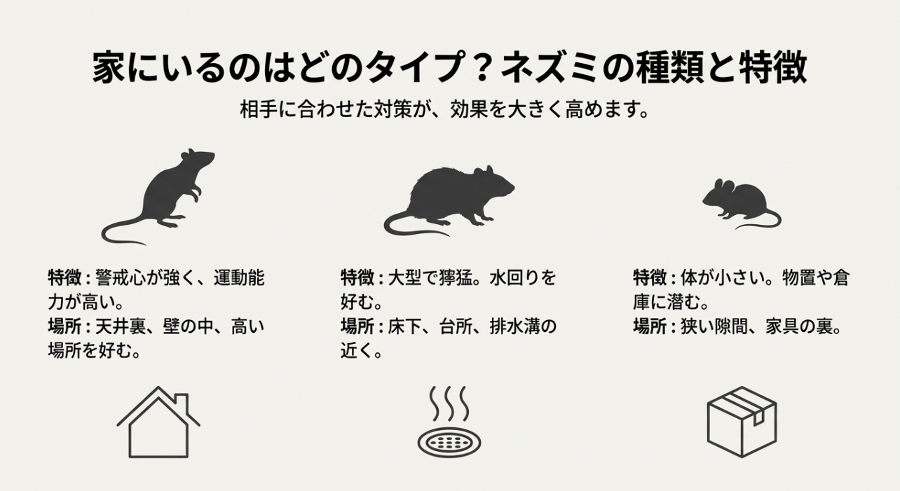 種類の話をもう一段だけ具体化すると、クマネズミは高い場所(天井裏・壁の中・梁)を使い、警戒心が強い傾向。 ドブネズミは床下や下水周りなど湿り気のある場所に寄り、比較的パワーがある。 ハツカネズミは小型で、ほんの少しの隙間でも侵入できるのが厄介です。 あなたの家で「どれっぽいか」は、目撃情報より、音がする場所とフンの場所がヒントになります。 天井裏の足音が頻繁ならクマネズミ寄り、水回りや床下から気配がするならドブネズミ寄り、家具の裏で小さなフンが見つかるならハツカネズミ寄り、みたいに。