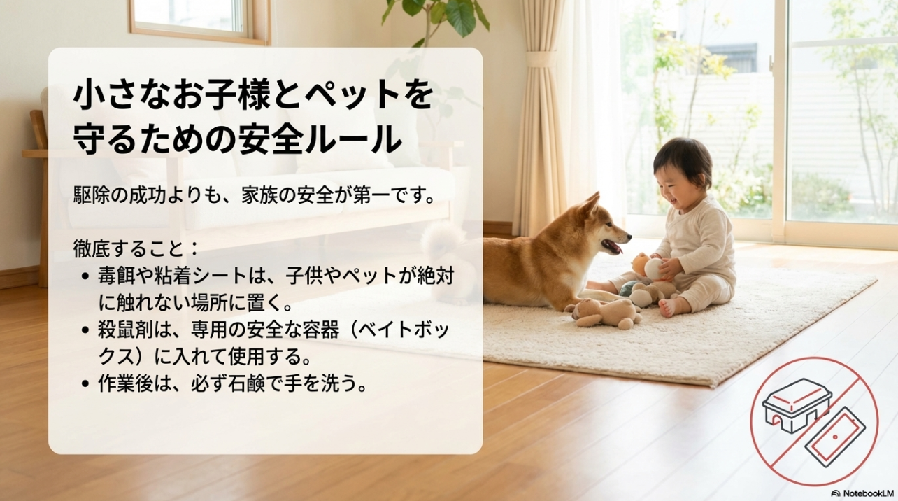 殺鼠剤は、誤飲・誤食が起きると命に関わるリスクがあります。 子どもやペットがいる家庭では、設置方法(専用ケース・手の届かない位置・立ち入り制限など)を徹底し、製品表示と公式情報を必ず確認してください。 最終的な判断は専門家への相談が安全です。